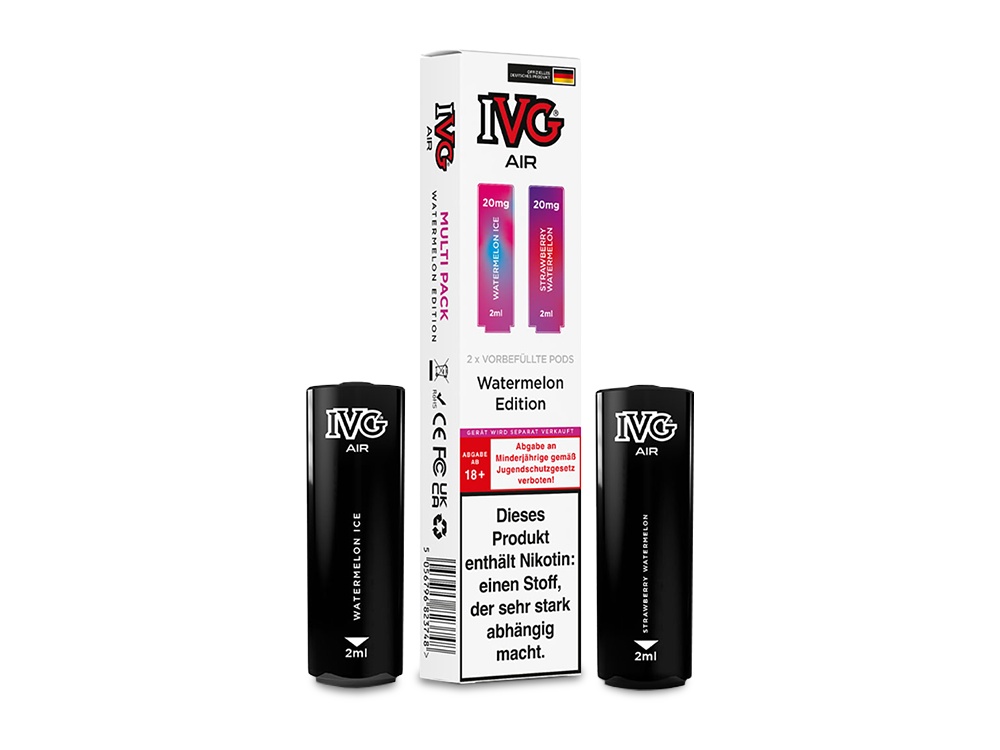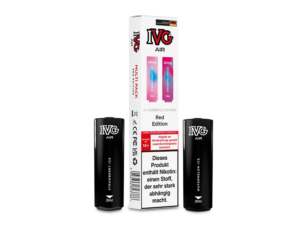 Der IVG AIR Multi Flavour Pod ist die ideale vorbefüllte Cartridge für den AIR 2in1 Akku von IVG, die speziell für dessen Einsatz konzipiert wurde. Ausgestattet mit einer integrierten 1,0 Ohm Mesh Coil sorgt der Pod für ein erstklassiges Dampferlebnis. Diese wechselbaren Cartridges haben ein Fassungsvermögen von 2 Millilitern und sind mit Nikotinsalz-Liquid in einer Stärke von 20 mg/ml befüllt. Der IVG AIR 2in1 Akku ermöglicht die gleichzeitige Verwendung von zwei AIR Multi Flavour Pods, was einen mühelosen Wechsel zwischen verschiedenen Geschmacksrichtungen durch einfaches Drehen des Mundstücks erlaubt. Bei den AIR Multi Flavour Pods sind immer zwei unterschiedliche Geschmäcker enthalten. Zum Beispiel bietet die "Red Edition" die Sorten Strawberry Ice und Watermelon Ice, während die "Mango Edition" die Geschmäcker Peach Mango Ice und Tropical Fruits umfasst. Insgesamt stehen Ihnen 10 verschiedene Editions zur Auswahl. Bitte beachten Sie, dass die IVG AIR Multi Flavour Pods nicht nachfüllbar sind. Sobald der Liquidvorrat erschöpft ist, müssen sie ersetzt werden. Bei jeder Bestellung erhalten Sie daher zwei Cartridges in der von Ihnen gewählten Geschmacks-Edition.Auszeichnung gemäß CLP-Verordnung (EG) Nr. 1272/2008