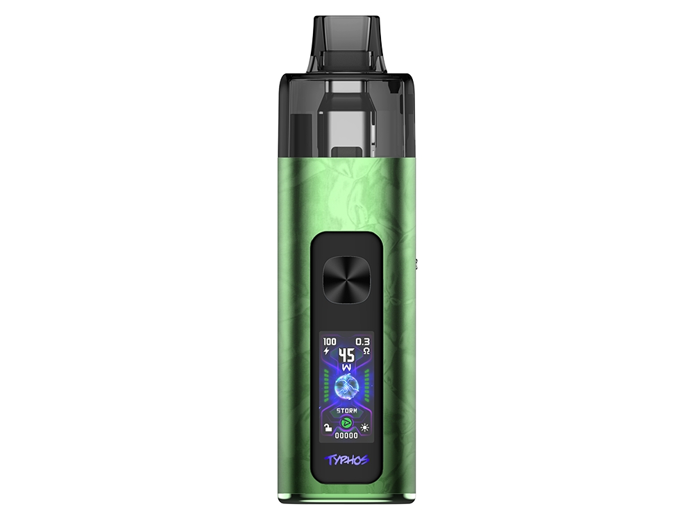 Das Uwell Typhos E-Zigaretten Set besteht aus dem Typhos Akku mit 2.000 mAh Kapazität und einer maximalen Ausgangsleistung von 45 Watt. Ein 1,05-Zoll HD-Farbdisplay zeigt die Betriebsmodi Storm und Waves an. Der Lieferumfang beinhaltet zwei Typhos Pods: einen vorinstallierten 0,3 Ohm Pod für direktes Lungendampfen (DTL) sowie einen 0,6 Ohm Pod für MTL/RDL. Beide Pods haben ein Tankvolumen von 6,0 ml und ein Side-Filling-System. Das Gerät ist mit einer Airflow Control ausgestattet. Da die Verdampferköpfe in den Pods fest verbaut sind, ist die Einheit als Ganzes auszutauschen. Ersatz-Pods sind separat in Zweierpackungen verfügbar. Der Akku wird über einen USB-C Anschluss mit DC 5V/2A geladen.